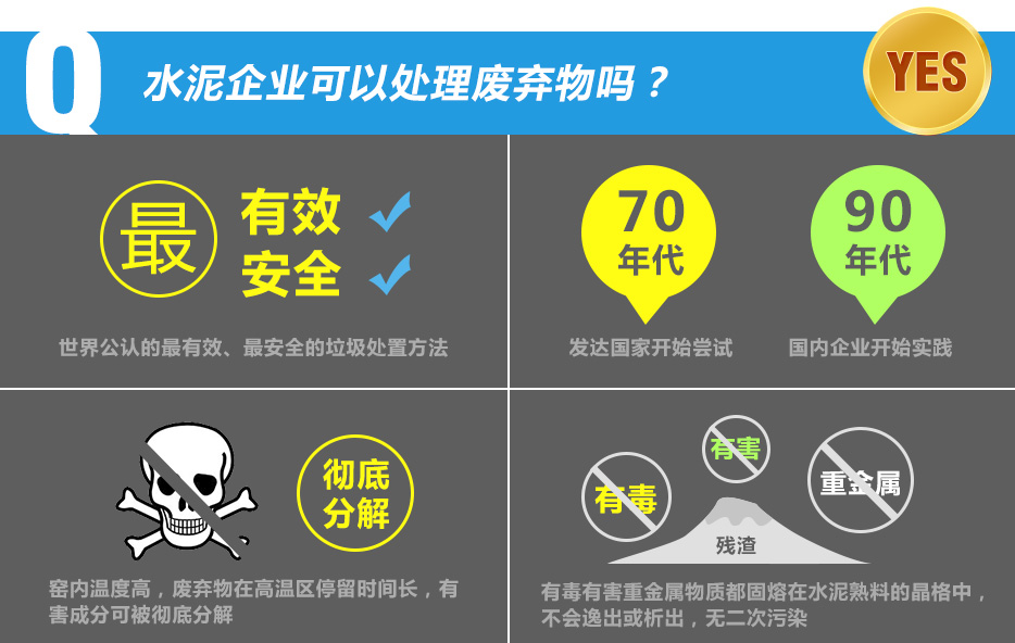 ? ?[核心提示]水泥窯協(xié)同處置廢棄物是世界公認(rèn)的最有效、最安全的垃圾處置方法。上世紀(jì)70年代,發(fā)達(dá)國(guó)家開始嘗試; 90年代國(guó)內(nèi)企業(yè)開始實(shí)踐。在水泥生產(chǎn)過(guò)程中,利用窯內(nèi)高溫,廢棄物在高溫區(qū)停留時(shí)間長(zhǎng),有害成分可被徹底分解,同時(shí),殘?jiān)械牧颉⒙然蛑亟饘俚扔泻ξ镔|(zhì)可固熔在熟料的晶格中,無(wú)二次污染。